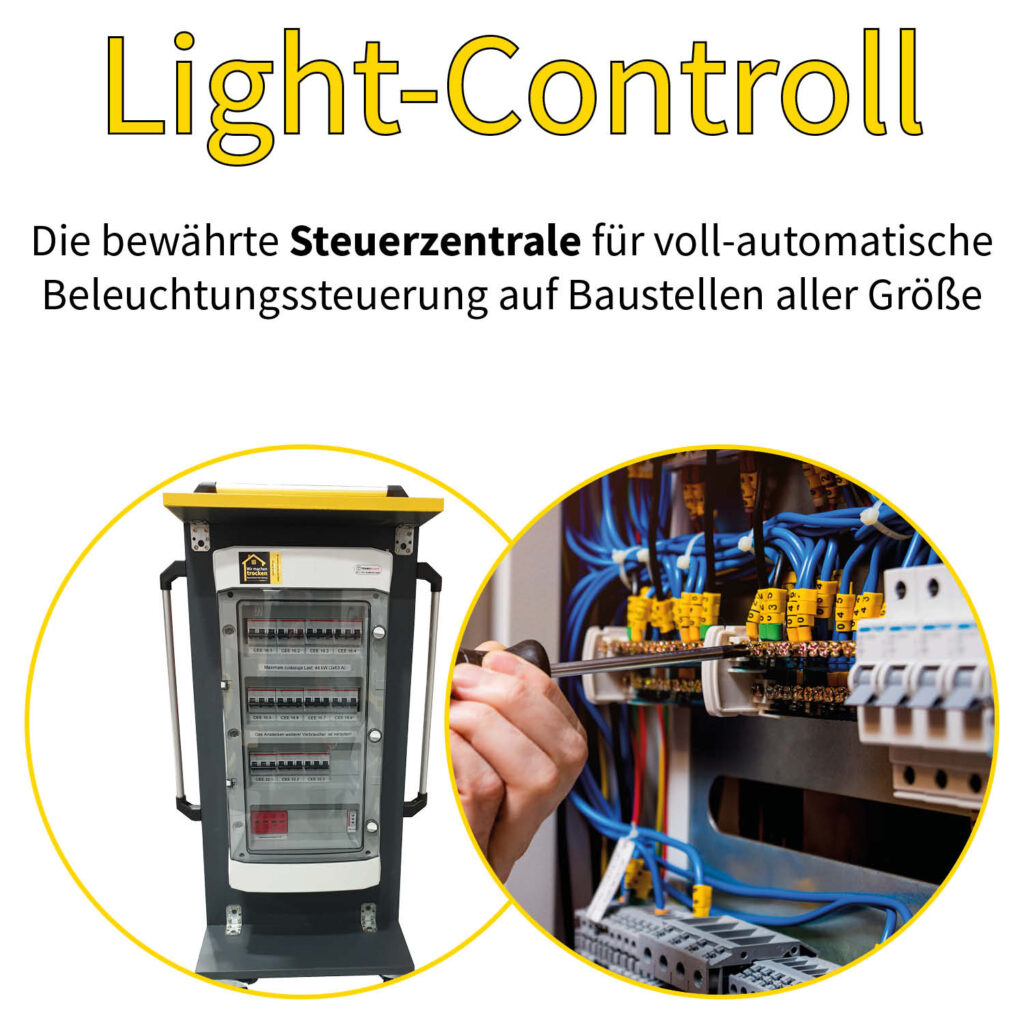 Wäre es nicht toll, wenn am Ende vom Tag niemand das Licht auf der Baustelle ausschalten muss? Dann ist Light-Control genau das richtige für Ihre Baustellen-Beleuchtung. Denn dies übernimmt die intelligente Lichtsteuerung vollautomatisch für Sie.